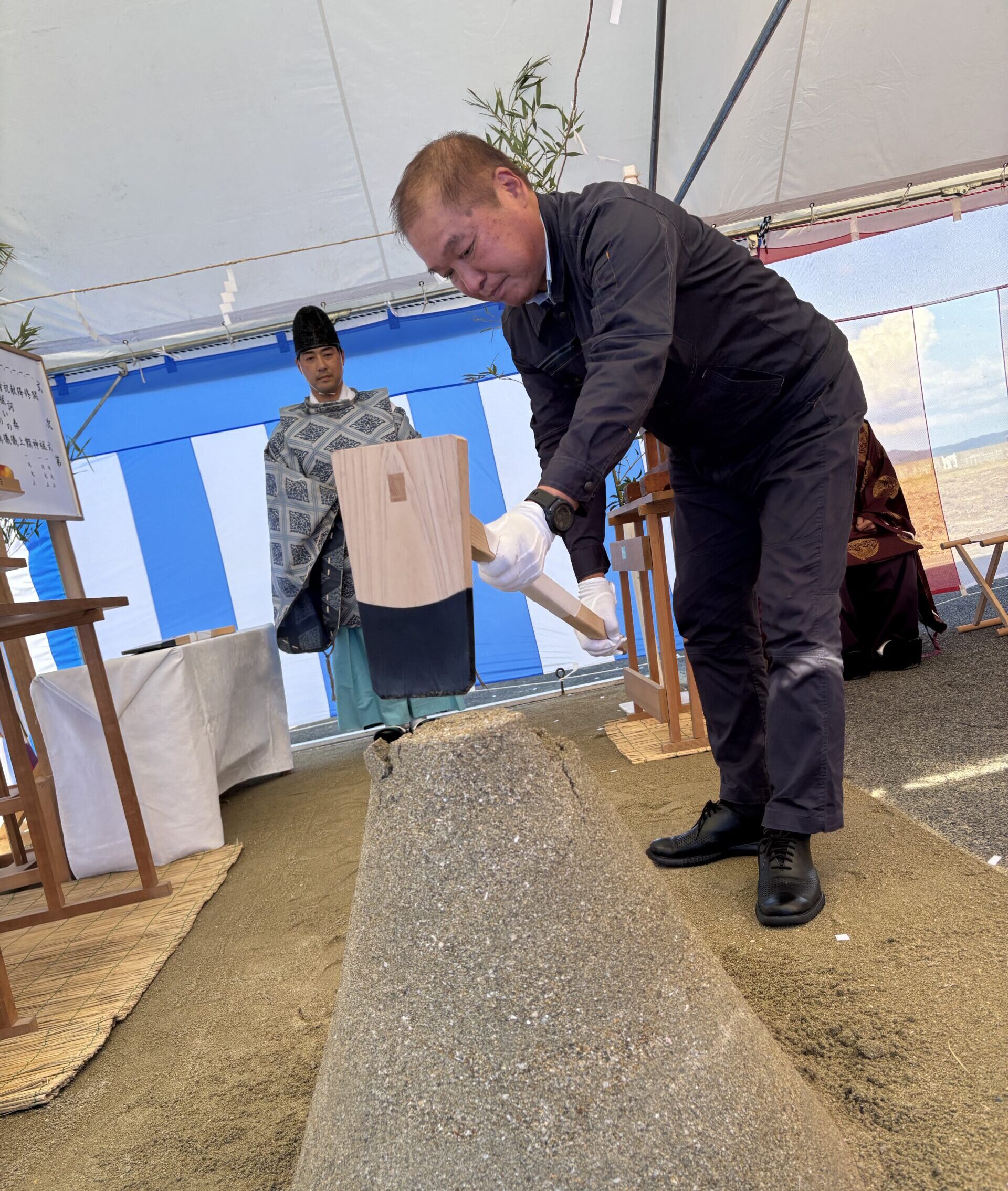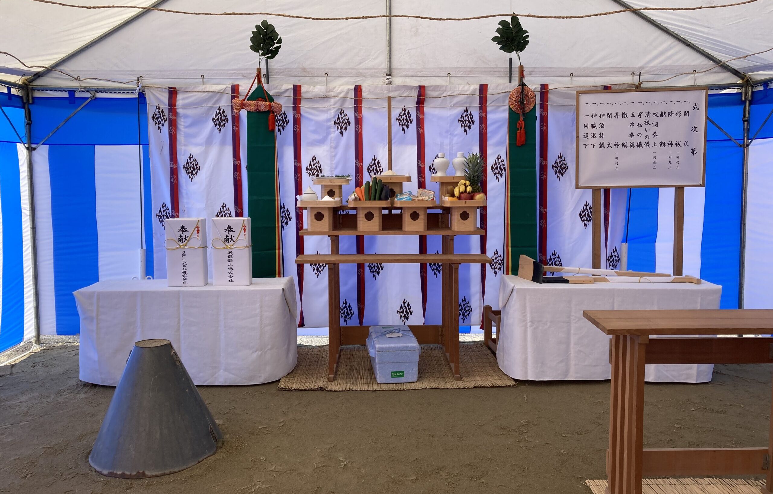 当日は秋晴れの好天に恵まれ、施工主の JFEシビル株式会社様 をはじめ、多くの皆様にご参列いただき、工事の安全と新工場の順調な完成を祈願いたしました。