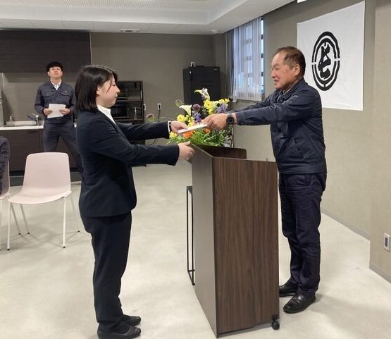 少し緊張しつつもフレッシュな表情で、社長から辞令を受け取りました。